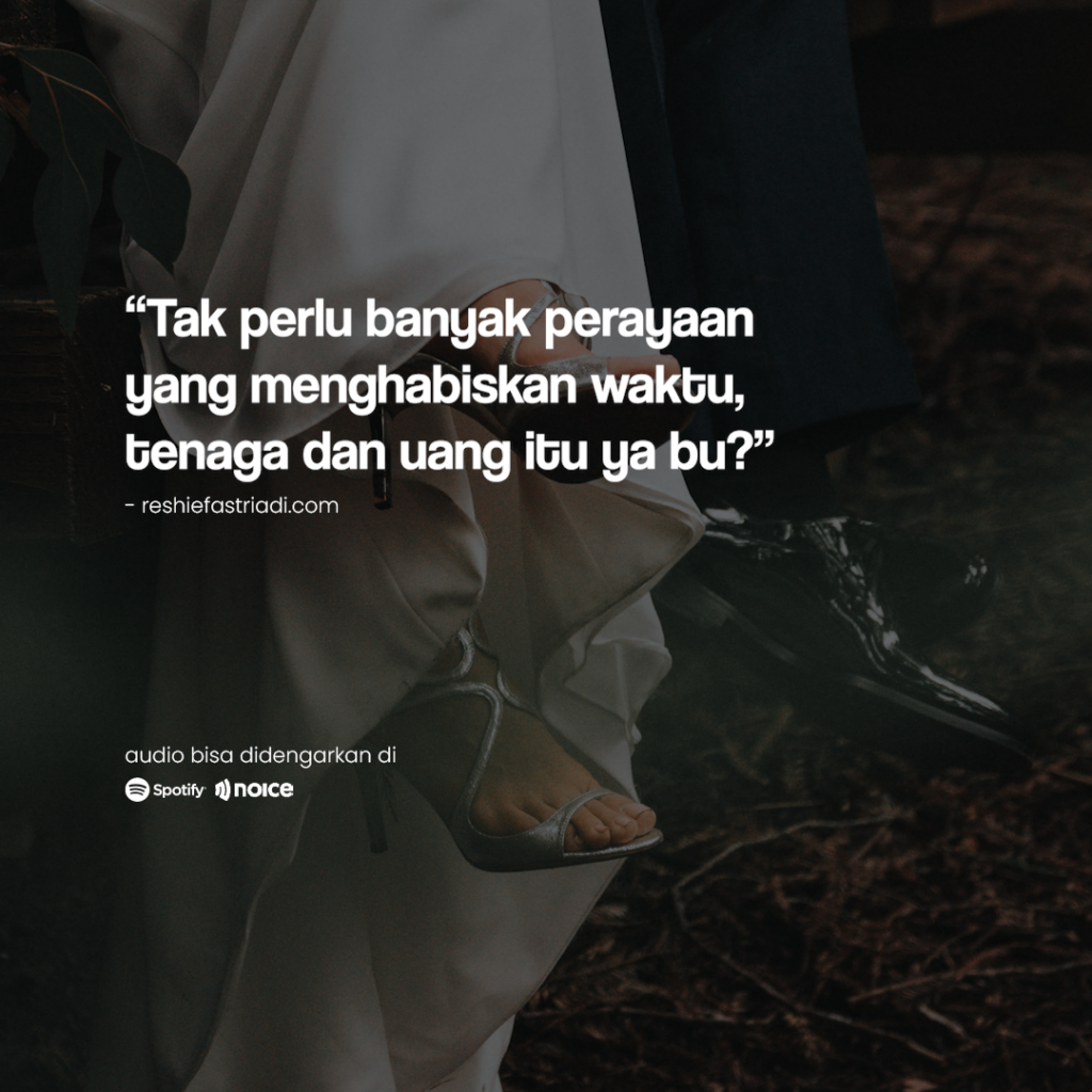 Lebaran kemarin tak ada pertanyaan “KAPAN RABI?” dari orang-orang komplek. Mungkin mereka bosan karena selalu kujawab sekenanya tiap lebaran. Padahal ya, aku sudah menyiapkan jawaban paling panjang dan detail. Begini… Kami punya rencana rabi tahun ini. Akan kami kemas dengan sederhana dan intim. Tak perlu banyak tamu undangan. Hanya teman-teman dekat yang diundang. Sebab, kami […]